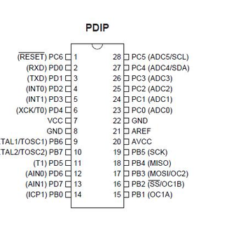 Диаграмма размещения выводов ATmega8 показана на рисунке 3.4. Микроконтроллер в отличие от своих предшественников имеет 28 выводов, поэтому нет необходимости использовать одни и те же контакты для различных функций. Например, отдельные выводы отведены под тактовый генератор (выводы 9 и 10) и сигнал сброса (вывод RESET). Тем не менее, в сравнении с большинством других моделей, ATmega8 остается небольшим микроконтроллером.