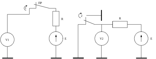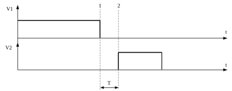 Диаграмма V2 по длине соответствует времени перелёта ножей разъединителя. Время от заднего фронта V1 до переднего фронта V2 и будет являться измеряемым временем T, следовательно, необходимо использовать логический элемент “И–НЕ”, входы которого подключаются к зажимам вольтметров V1 и V2, а выход к сигнальному проводу прибора.