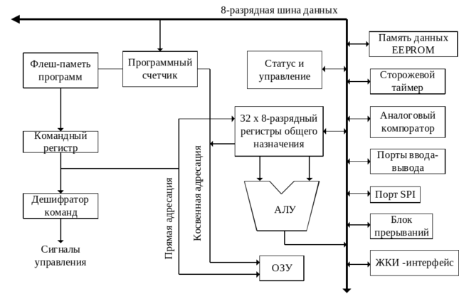 Высокая эффективность микроконтроллеров ATmega8 достигается за счет архитектуры ядра, подобная архитектура обычно применяется в RISC микропроцессорах.