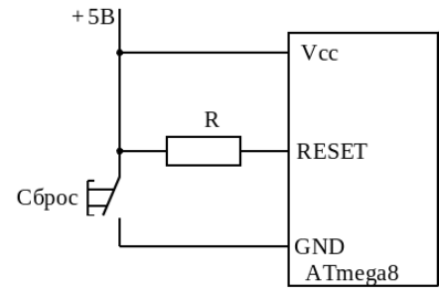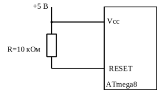 - внешний сброс. Микроконтроллер переходит в состояние сброса, если на вывод RESET подать низкий логический уровень на время дольше, чем минимальная длительность импульса сброса;