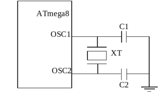 Кварцевый или керамический резонатор подключается к выводам OSC1, OSC2 показан на рисунок 3.7. Использование резонаторов с последовательным резонансом может привести к получению тактовой частоты, не соответствующей параметрам резонатора.
