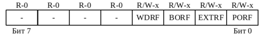 | EXTRF | Флаг аппаратного сброса. Устанавливается в «1», если сброс произошел в результате подачи на вывод сброса сигнала низкого уровня. Разряд сбрасывается в результате сброса по питанию или непосредственной записью в него лог. 0 |