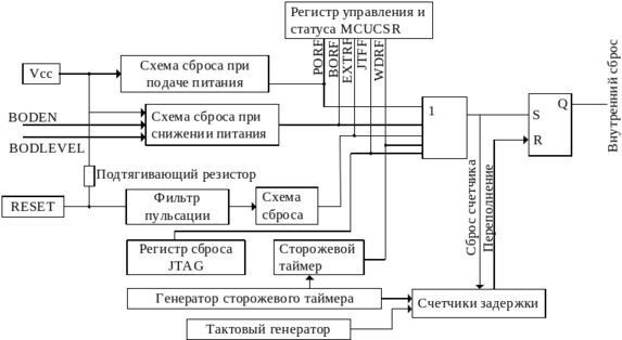 Логика схемы сброса всех микроконтроллеров семейства Mega следующая. При наступлении события, приводящего к сбросу микроконтроллера, формируется внутренний сигнал сброса. Одновременно запускается таймер формирования задержки сброса. По истечении определенного промежутка времени внутренний сигнал сброса снимается и начинается выполнение программы.