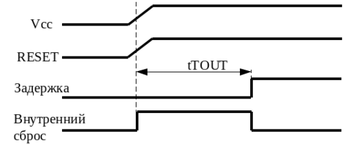 При достижении напряжением питания значения схема POR запускает таймер задержки сброса. По окончании счета (после формирования задержки tTOUT) внутренний сигнал сброса снимается и происходит запуск микроконтроллера.