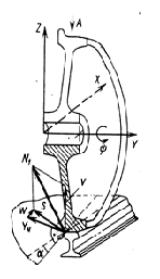 Рисунок 1.2 – Силы, возникающие в точке контакта колеса с рельсом при одноточечном контакте