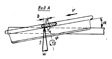 Мгновенная ось вращения колеса, движущегося по рельсу без проскальзывания, проходит через центр контакта колеса и рельса перпендикулярно оси рельса. Гребень колеса воспринимает направляющую силу от рельса на некотором расстоянии