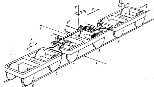 Традиционный способ – сочленение тележек в поперечном направлении для перераспределения направляющих сил. Такой способ можно увидеть на швейцарском электровозе Re 6/6 с осевой формулой 2о-2о-2о, и все тележки сочленены в поперечном направлении. Традиционный способ представлен на рисунке 2.14.