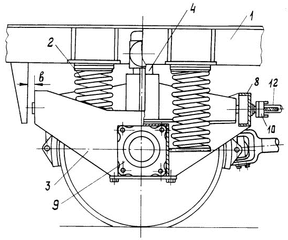 Рама 1 железнодорожного транспортного средства опирается через пружины 2 рессорного подвешивания на боковые балки 3 одноосной тележки. Шкворень 4, укрепленный на раме 1, входит в шкворневое гнездо 5, установленное на продольной балке 6, укрепленной на цапфах 7 к поперечным балкам 8 рамы тележки с возможностью поворота вокруг продольной оси (по отношению к оси пути) рамы 1. Букса 9 неподвижно установлена в проеме боковой балки 3 снизу.