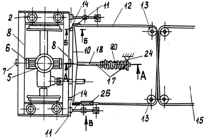 Торцовая опора 14 представляет собой жестко прикрепленную к балке 8 тележки шпильку 15 пропущенную через отверстие в рычаге 10 (рис. 4) с резьбой и гайкой 16 на конце, зафиксированной с возможностью взаимодействия с плечами рычага 10 при его горизонтальном смещении с выбором зазора "а" между гайкой 16 и рычагом 10. Такое выполнение обеспечивает поворот тележки в горизонтальной плоскости, при взаимодействии с рычагом.