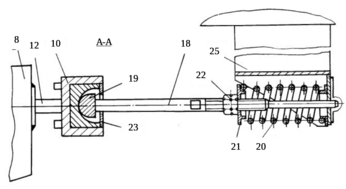 Рисунок 2.12 – Сечение А-А: 8 – поперечные балки; 10 – двуплечный рычаг; 12 – гибкие тяги; 18 – стержень; 19 – шаровая головка; 20 – упругий элемент; 21 – шайба; 22 – гайка; 23 – сферическое гнездо; 25 - кронштейн