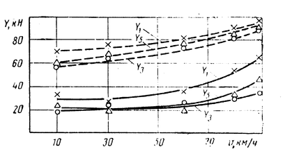 Эта схема соответствует моменту вписывания в кривую первой по ходу тележки. Поворачивая она вызывает передачу сил через упругую связь на третью тележку, которая разворачивается наружу кривой под действием вилы F, создающей момент Мз. Средняя тележка под действием силы F и прижимается к внутреннему рельсу, занимая положение перекоса, а затем хордовое. Результаты испытаний электровоза, представленные на рисунке 2.15, без сочленений и с сочленением тележек при различных скоростях в кривой радиусом 300 м при одинаковых погодных условиях, показали следующее.