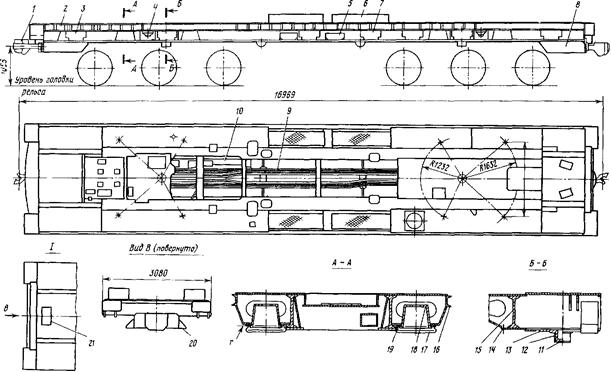Рисунок 3.7 – Рама тепловоза: 1 – ударно-тяговые приборы; 2,3 – балласты; 4 – кронштейн для подъема на домкратах; 5–кронштейн для крепления топливного бака; 6 – ящик для аккумуляторов; 7 – желоб; 8 – стяжной ящик; 9 – кондуиты; 10 – каналы нагнетательные; 11 – заглушка; 12 – кольцо шкворня; 13 – шкворень; 14 – полоса усиливающая; 15 – хребтовая балка; 16 – швеллер обносной; 17 – обечайка; 18 – стакан; 19 – кольцо опорное; 20 – кронштейн для крепления путеочистителя; 21 – балласт дополнительный; I – передняя часть рамы средней секции тепловоза