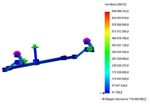 Построив модель тележки и под геометрические размеры тележки построили геометрическую систему доворота, взяв систему доворота открыв ее c помощью SolidWorks Simulation, выбрали материал, и зафиксировав ее как жесткую заделку указали в каких местах действуют силы, указали с какой силой действуют на саму систему, и запускали процесс симуляции. Система доворота представлена на рисунке 4.7