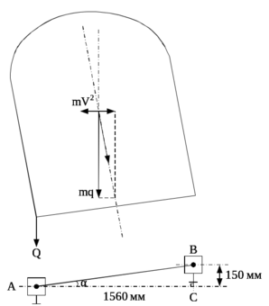 Для проверки на прочность нашей системы доворота, нужно найти максимальную силу действующую в кривой на нее. Для этого нужно знать, что при входе в кривую на состав действует центробежное ускорение