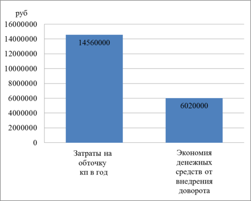 Затраты на обточку колесных пар в год равны 14560000 рублей, при этом обтачивается 624 колесных пар (согласно данным, взятым в депо Раздольное). После внедрения доворота, количество обточек в год составило 366 колесных пар, а их стоимость обошлась локомотивному депо в 8540000 рублей. Экономия денежных средств составила: