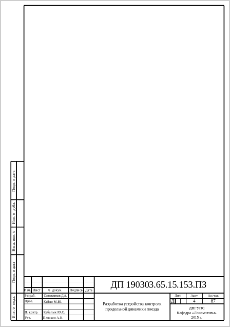 В дипломном проекте разрабатывается устройство контроля продольной динамики в поезде. Устройство предназначено для измерения и анализа динамических процессов, происходящих во время движения. Детальное изучение динамики движения поезда позволит организовать регулярное вождение тяжеловесных и длинносоставных поездов и повысит провозную способность железных дорог.
