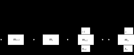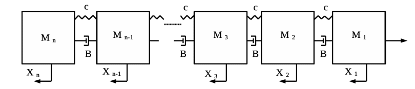 Первые математические модели динамики железнодорожного состава в России были представлены Н.Е. Жуковским [10]. Одна из этих моделей представляла поезд в виде упругого стрежня с массой на одном из концов. Эта модель позволила использовать для решения задачи о продольных колебаниях поезда аппарат уравнений математической физики. Вторая модель Жуковского представляла поезд в виде цепочки упруго соединенных твердых тел. Обе модели позволяли лишь оценить наибольшие силы, возникающие при трогании растянутого поезда. Эта модель поезда Жуковского представлена на рисунке 1.1.