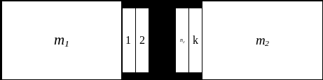 В общем случае рассматривается некоторое обобщенное соединение, состоящее из нескольких последовательно включенных деформируемых элементов разной физической природы. Буквой k обозначен элемент, имитирующей продольную податливость кузова вагона. Этот элемент может быть упругим с гистерезисом, если рассматривается нагружение в области упругих деформаций, или упругопластическим за пределами упругих деформаций. Цифрами 1,2, …, na обозначены поглощающие аппараты или их составные части, которые можно представить в виде простых или сложных деформируемых элементов соединения. В свою очередь в зависимости от конструкции сами поглощающие аппараты состоят из параллельно или последовательно включенных элементов сопротивления деформированию. Один из последовательно включенных элементов имитирует деформацию корпуса аппарата и сжатие жидкости, а каждый из двух других состоит из параллельно включенных элементов сопротивления перетеканию жидкости через дроссельные отверстия.