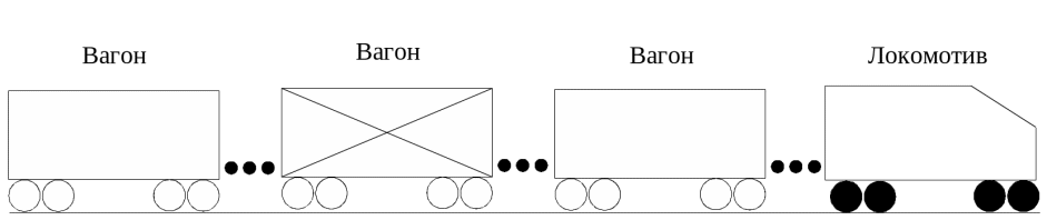 Пассажирский поезд обычно состоит из десятков вагонов, в то время как в грузовом – сотни вагонов и несколько локомотивов, приводящих поезд в движение. На железнодорожных магистралях Китая масса поезда может достигать 20000 тонн, количество вагонов – 300, а длина несколько километров. На рисунке 1.5 изображен поезд, состоящий из n единиц подвижного состава и у каждая из них обладает m степенями свободы. Количество степеней свободы всего поезда равняется n умножить на m. Уравнение движения железнодорожного состава выражается следующим образом: