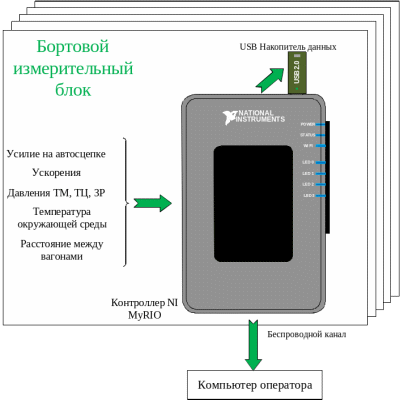 Разрабатываемое устройство продольной динамики состоит из бортовых измерительных блоков, рабочей станции оператора и программного обеспечения сбора данных. Структурная схема системы представлена на рисунке 4.6.