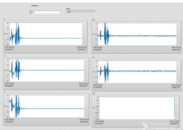 На лицевой панели отображены цифровые осциллографы, показывающие ускорения всех осей акселерометров, графа настройки уровня, начиная с которого будет считаться фаза между ударами, и строка отображения этой фазы.