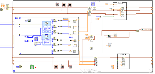 В основной программе производится объединение всех данных в один массив с помощью блока «Build array» для более удобной передачи данных с контроллера MyRIO на управляющий компьютер, на котором и осуществляется сохранение измеренных данных. Передача осуществляется с помощью блока виртуальной библиотеки
