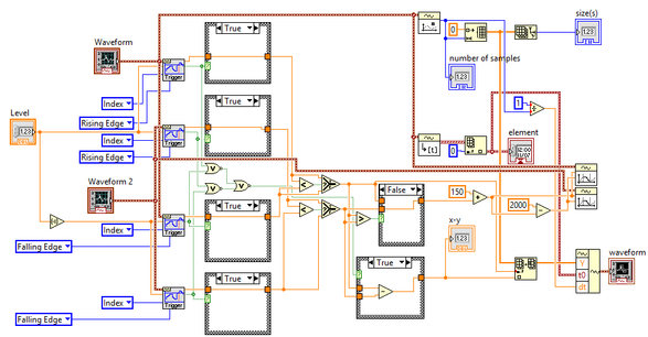 Определение фазы удара необходимо производить на продольной оси, то есть на оси Y. Для этого была написана подпрограмма, принцип работы которой заключается в следующем. На выходе из цикла For Loop получается массив размером 2000 значений, каждое значение – это измеренное ускорение, которое было зафиксированы за прошедшую секунду. После объединения этого массива с сигналом, формируемым блоком «Build Waveform», у каждого значения ускорения появляется значение времени, которое обозначает тот момент, когда было зафиксировано ускорение. При помощи виртуального прибора «Basic Level Trigger Detection VI» находится индекс скаляра, который превысил заданный уровень на одном датчике, тоже самое производится и на втором датчике, после чего от одного индекса отнимается другой. Для определения фазы в милисекундах полученная разность умножается на коэффициент равный двум. Для определения времени фиксации фазы был создан массив, содержащий в себе одни нули, после чего один ноль с индексом, равным индексу значения ускорения, в котором произошло превышение заданного уровня, заменяется на время распространения ударной волны. После чего этот массив с помощью блока «Build Waveform» преобразуется в сигнал, содержащий в себе время фиксации измеренных значений.