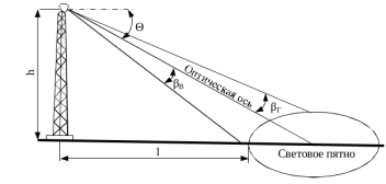 Следует помнить, что при установке прожектора на мачте с углом наклона у её подножия остается неосвещенная зона, длина которой увеличивается с уменьшением угла. Длину неосвещенной зоны вычисляют по формуле: