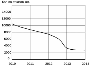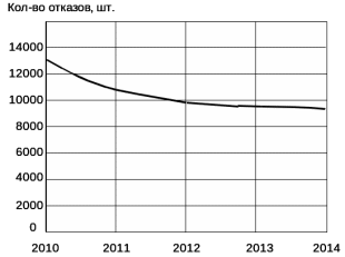 Количество отказов рельсовой линии как и количество неисправностей нормальной работы устройств СЦБ с каждым годом снижается. Стоит отметить, что в отчетах за 2012 и 2013 годы количественные показатели не совпадают, поэтому график имеет резкий спад.