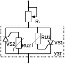 Устройство защиты тиристорное (УЗТ) предназначено для защиты путевой аппаратуры рельсовых цепей от коммутационных перенапряжений, возникающих на электрифицированных участках железных дорог (обрыв контактного провода, короткое замыкание на электровозе, перекрытие изоляции контактной подвески). Для защиты питающих и релейных концов рельсовых цепей используются УЗТ-1 с рабочим напряжением до 220 В. Устройства УЗТ выпускаются с 1989 года и устанавливаются взамен разрядников типа РВНШ-250. На рисунке 2.7 приведена схема устройства УЗТ.