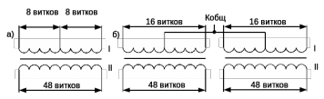 Рисунок 2.5 – Схемы соединения обмоток дроссель-трансформаторов типа ДТ-1-150 (а) и 2ДТ-1-150 (б)