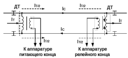 Принцип работы ДТ заключается в следующем: часть тягового тока IТ1, проходя по одному из рельсов, оказывается в одной полуобмотке ДТ. В это время другая часть тягового тока IТ2 течет через вторую полуобмотку ДТ. Суммарный ток IТ через междроссельную перемычку попадает в среднюю точку основной обмотки смежного ДТ и, разделившись на две части, проходит по рельсовым нитям соседней цепи (рисунок 2.4).