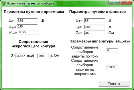 Как видно из рисунка 2.3, при расчете можно изменять параметры путевого приемника, путевого фильтра, общее сопротивление искрогасящего контура. Особенностью алгоритма расчета является учет параметров приборов защиты по току и по напряжению. В процессе эксплуатации их характеристики могут изменяться. Например, приборы защиты от перенапряжения имеют свойство снижать свое сопротивление при росте количества срабатываний, что приводит к снижению напряжения на путевом приемнике, так как увеличится ток, протекающий через эти приборы.