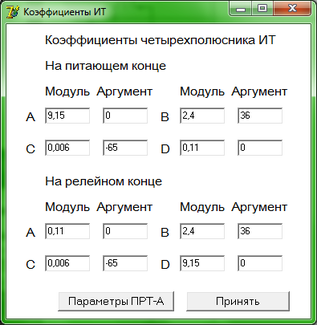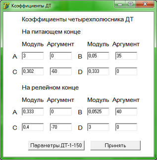 На рисунке 2.1 отражен интерфейс программы. Пользователю предоставляется возможность изменения основных параметров, таких как удельное сопротивление рельсовой линии z, длина рельсовой цепи LРЦ, удельное сопротивление изоляции rИЗ и другие. Также допускается корректировка коэффициентов четырехполюсников дроссель-трансформаторов, изолирующих трансформаторов (рисунок 2.2) и нормативных значений параметров приборов (рисунок 2.3).