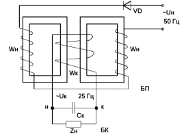 Обмотки WН включены так, что их магнитные поля компенсируются (вычитаются), и поэтому не создают в обмотке WК ЭДС. Однако от каждого импульса тока частотой 50 Гц эти обмотки создают магнитный поток в сердечнике, что приводит к изменению индуктивности катушки WК, при этом в колебательном контуре создается переменный ток с частотой 25 Гц.