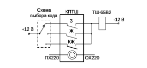 Для кодирования рельсовых цепей заводами изготовителями было выпущено несколько типов трансмиттерных реле, отличающихся конструкцией, рабочим напряжением, исполнением контактов и схемным включением. Наиболее распространенным в настоящее время является реле (ячейка) типа ТШ-65В2. Схема включения реле ТШ-65В2 для кодирования кодовой рельсовой цепи представлена на рисунке 2.12. Режим работы ячейки выбирается контактами кодового трансмиттера КПТШ.