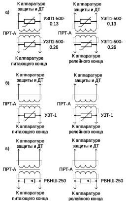 Рисунок 2.8 – Схемы включения аппаратуры защиты от перенапряжения: а) УЗП1-500, б) УЗТ, в) РВНШ-250