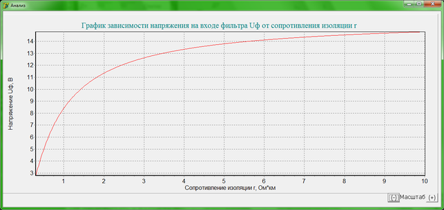 В разработанной программе пользователю предоставляется возможность выполнить анализ зависимости напряжения на входе путевого фильтра UФ от удельного сопротивления изоляции rИ. Окно с анализом нормального режима представлено на рисунке 2.18. С увеличением удельного сопротивления изоляции напряжение на входе фильтра возрастает, так как снижаются потери энергии при протекании сигнального тока по рельсовой линии.