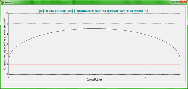Зависимость коэффициента КШ при изменении места наложения нормативного шунта представлена на рисунке 2.20. Как видно, максимальное значение коэффициент чувствительности рельсовой цепи к шунту принимает в середине рельсовой линии, минимальные значения соответствуют началу (питающий конец) и концу (релейный конец) рельсовой цепи, причем шунтовой режим для кодовой рельсовой цепи для заданных параметров выполняется.