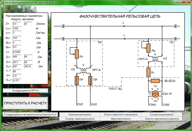Для контроля состояния станционных приемоотправочных, стрелочных и межстрелочных участков пути при автономной тяге, а также на неэликтрифицированных путях станций при электротяге постоянного тока широкое распространение получили фазочувствительные рельсовые цепи, обладающие повышенной помехозащищенностью. Для участков с автономной тягой чаще всего применяются бездроссельные фазочувствительные цепи с реле типа ДСШ-16, имеющим наибольший коэффициент надежного возврата по сравнению с другими реле типа ДСШ. Интерфейс программы расчета основных режимов работы и принципиальная схема фазочувствительной рельсовой цепи представлены на рисунке 2.24.