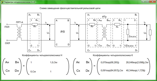 Рисунок 2.27 – Окно программы расчета со схемой замещения рельсовой цепи и параметрами четырехполюсников Н и К