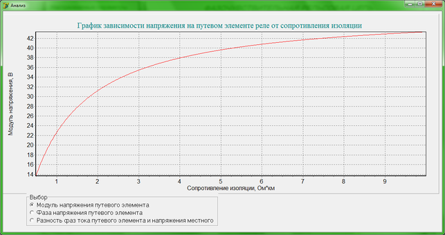 Рисунок 2.30 – Окно с графиком зависимости напряжения путевого элемента реле ДСШ-16 от удельного сопротивления изоляции рельсовой линии