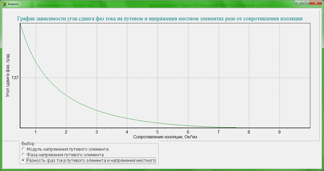Рисунок 2.31 – Окно с графиком зависимости угла сдвига фаз тока путевого и напряжения местного элементов реле ДСШ-16 от удельного сопротивления изоляции рельсовой линии