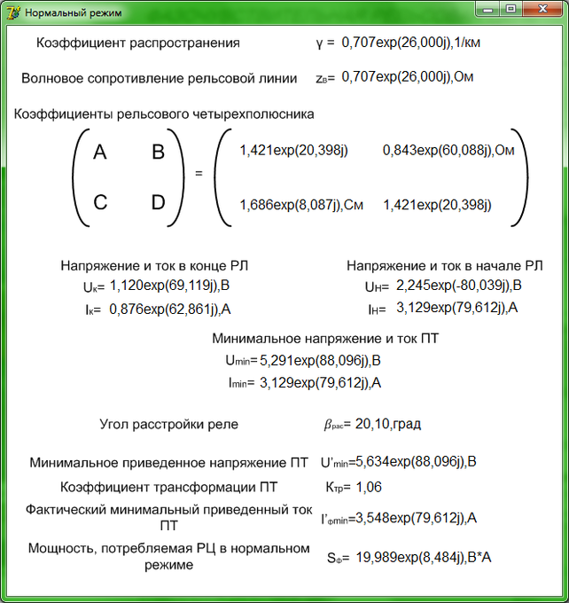 Рисунок 2.29 – Окно результатов расчета нормального режима фазочувствительной рельсовой цепи