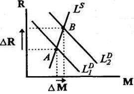 Очевидно, что Центральный банк не в состоянии одновременно фиксировать денежную массу и ставку процента. Например, для поддержания относительно устойчивой ставки при увеличении спроса на деньги ЦБ вынужден будет расширить предложение денег, чтобы сбить давление вверх на ставку процента со стороны возросшего спроса на деньги (это отразится сдвигом вправо кривой LD и перемещением точки равновесия вправо вдоль кривой LS) (рис. 1.2).