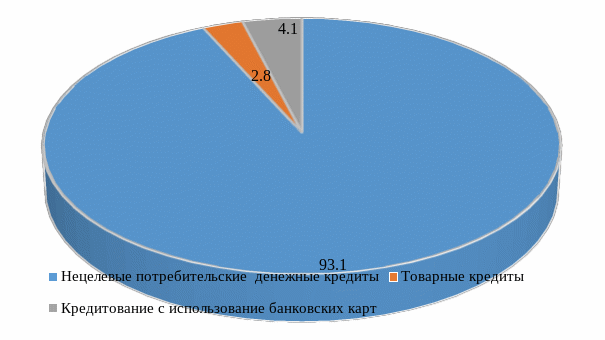 Структура кредитного портфеля физических лиц за три года по срочности вкладов существенных изменений не претерпела и наиболее предпочтительными являются нецелевые денежные потребительские кредиты – 93,1%