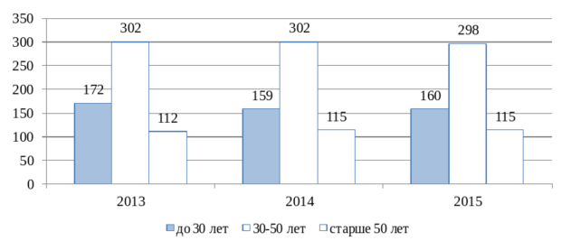 Рисунок 3.5 - Возрастной состав сотрудников в 2013-2015 г.