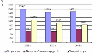 Отпуск воды в 2014 г. составил 1470,1 тыс. м3, что на 19,2 тыс. м3 или на 1,3 % выше показателей 2013г. Фактические потери, с учетом хозяйственных нужд структурных подразделений увеличились на 19,57 % или на 102,6 тыс. м3 и составили 626,9 тыс.м3. .