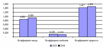 Данные таблицы 2.7 показывают, что за отчетный год техническое состояние основных средств на предприятии улучшилось. В 2014 году коэффициент ввода основных средств составил 0,93 . По сравнению с 2013 годом поступивших основных средств в 2014 году было больше на 0,07, это говорит о том, что на отчетную дату предприятие имело достаточное количество основных средств. Динамика коэффициентов ввода и вывода представлена на рисунке 2.5.