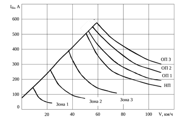 для электровозов переменного тока принимают по тяговых характеристикам при разгоне по ограничивающим линиям и при работе на рабочих позициях (зонах).